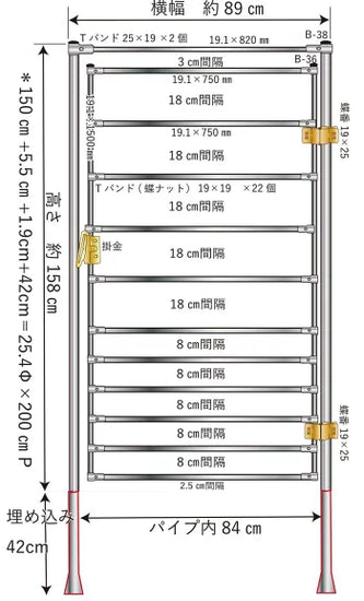| 材質 | 亜鉛メッキスチールパイプ、柱パイプΦ25.4×0.9、扉パイプΦ19.1×0.6 |