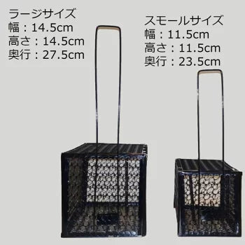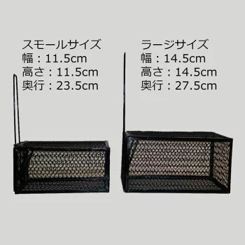 A small box trap suitable for catching mice. Metal anti-corrosion coating. It has a size of 23.5 cm in total length x 11.5 cm in width x 11.5 cm in height. There is also a large size that is one size larger.