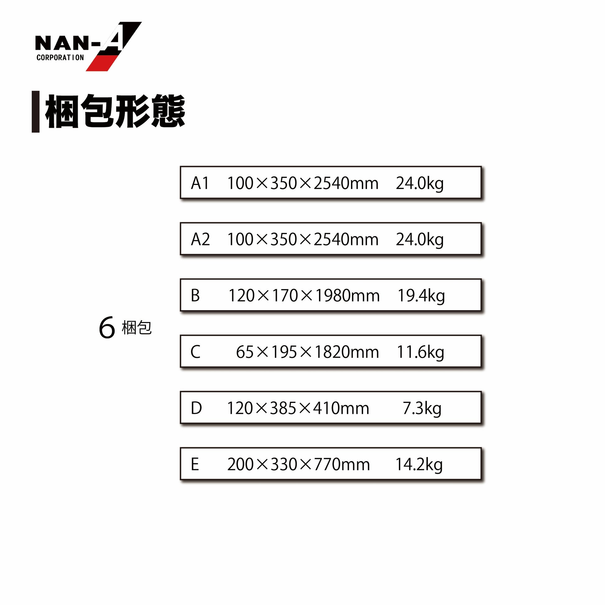 | 梱包サイズ | 6梱包 A1ケース W:350 × L:2540 × H:100mm / 24.0kg A2ケース W:350 × L:2540 × H:100mm / 24.0kg Bケース W:170 × L:1980 × H:120mm / 19.4kg Cケース W:195 × L:1820 × H:65mm / 11.6kg Dケース W:385 × L:410 × H:120mm / 7.3kg Eケース W:330 × L:770 × H:200mm / 14.2kg |
