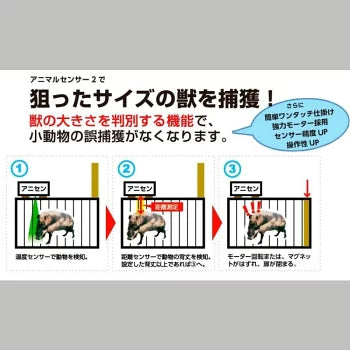 〇 Animal sensor (commonly known as Anisen) is a system that detects animals that have entered the box trap with an infrared sensor and automatically closes the door.
