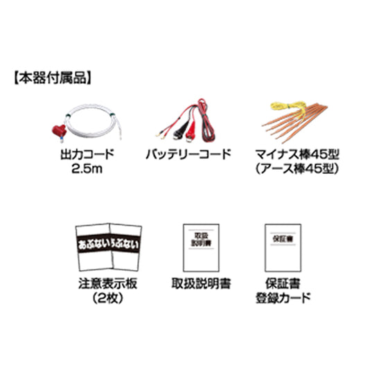 | 本体付属品 | 出力コード2.5m、バッテリー用コード、アース棒45型セット、危険表示板(2枚)、お客様カード、取扱説明書、保証書 |