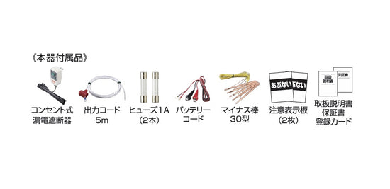 | 付属品 | コンセント式漏電遮断器、出力コード5m、ヒューズ1A(2本)、バッテリーコード、マイナス棒30型、注意表示板2枚、取扱説明書、保証書、登録カード |