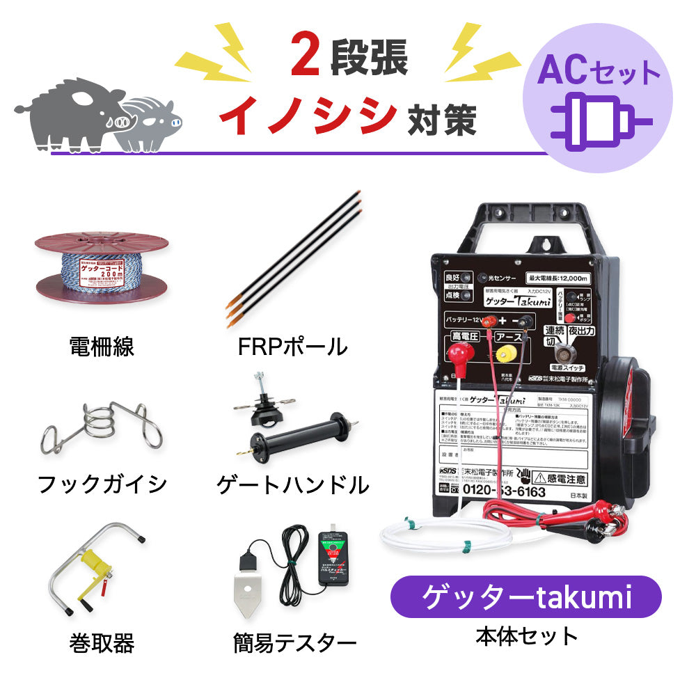 【2500m×2段張り】末松電子製作所 電気柵 ゲッターTakumiACセット イノシシ対策