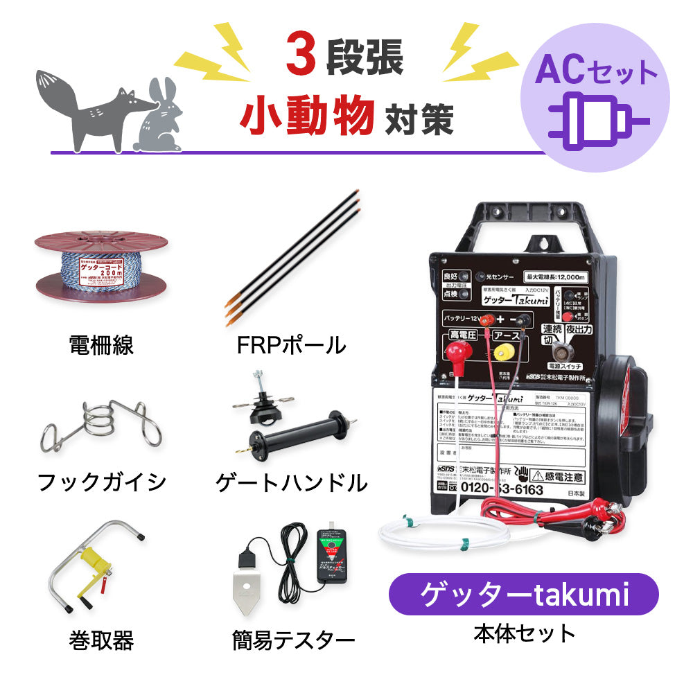 【2500m×3段張り】末松電子製作所 電気柵 ゲッターTakumiACセット 小動物対策