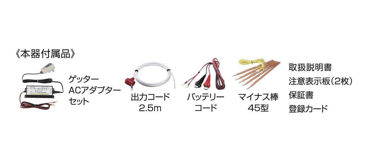 | 本体付属品 | ゲッターACアダプターセット、出力コード2.5m、バッテリー用コード、アース棒45型セット、危険表示板(2枚)、お客様カード、取扱説明書、保証書 |
