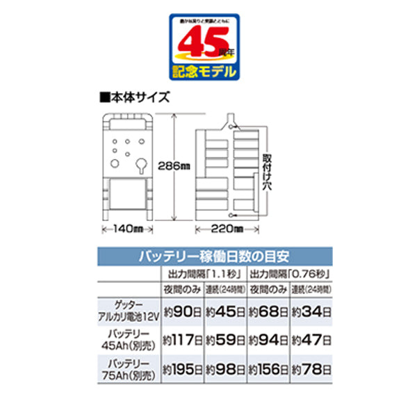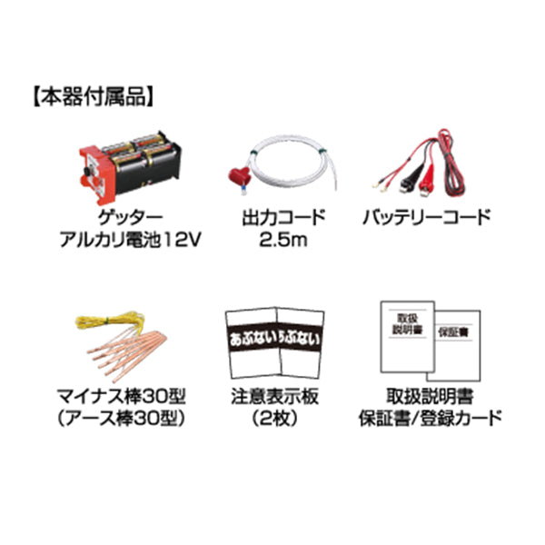 | 本体付属品 | ゲッターアルカリ電池12V、マイナス棒30型、バッテリーコード、注意表示板、本器取付ネジ(2本)、取扱説明書、保証書/登録カード |