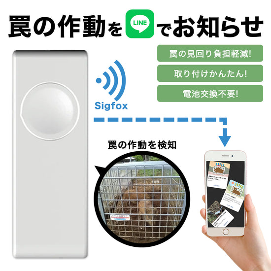 Kyocera Communication Systems Co., Ltd. uses the network of Sigfox, which provides services as a telecommunications carrier. There is no monthly communication fee, so you can use it only for the initial cost . As long as your smartphone is connected to the Internet, you can receive notifications wherever you are. It is recommended for those who live in an area far away from the place where the trap is set.