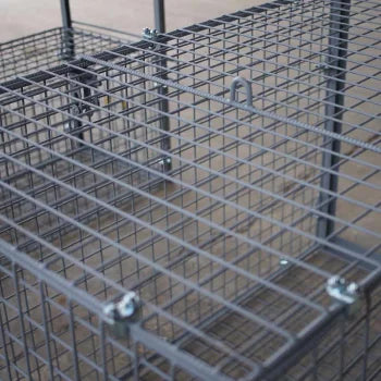 This is one of our box traps designed to catch monkeys. φ4mm wire mesh (mesh size: 50mm x 50mm) is used, and the entire perimeter of the mesh is edged with 3 steel bars of different diameters. *Capture of small animals such as cucurbits, civets, and badgers is also possible.